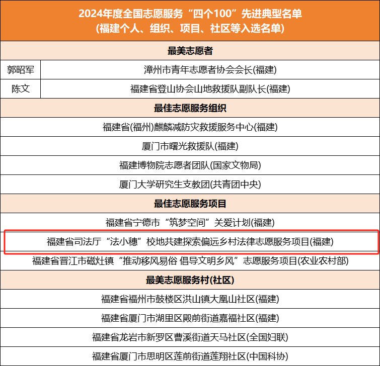 为大力弘扬志愿精神,培育志愿文化,发挥先进典型的示范引领作用,中央社会工作部等 22 个部门和单位组织开展了 2024 年度全国志愿服务“四个 100”先进典型宣传活动。经宣传发动、择优推荐、集中展示、专家评审等多轮严格筛选,福建省司法厅“法小穗”校地共建探索偏远乡村法律志愿服务项目成功入选2024年度全国志愿服务“最佳志愿服务项目”