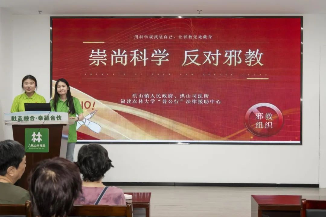 福建农林大学实践队前往福州洪山镇开展法律志愿服务活动。面向社区居民开展“崇尚科学,反对邪教”主题宣传活动,以情景剧表演、科学实验等方式,将反邪教与法治的课堂带到基层。同时联动福建医科大学实践队,面向洪山司法所的社矫人员展开“禁毒”、“社矫法”、“急救”和“防范艾滋”等主题的宣讲演绎,通过专业讲解、现场演示、情景模拟等方式,普及医学常识和急救知识,引导社区矫正人员树立正确的健康观念。